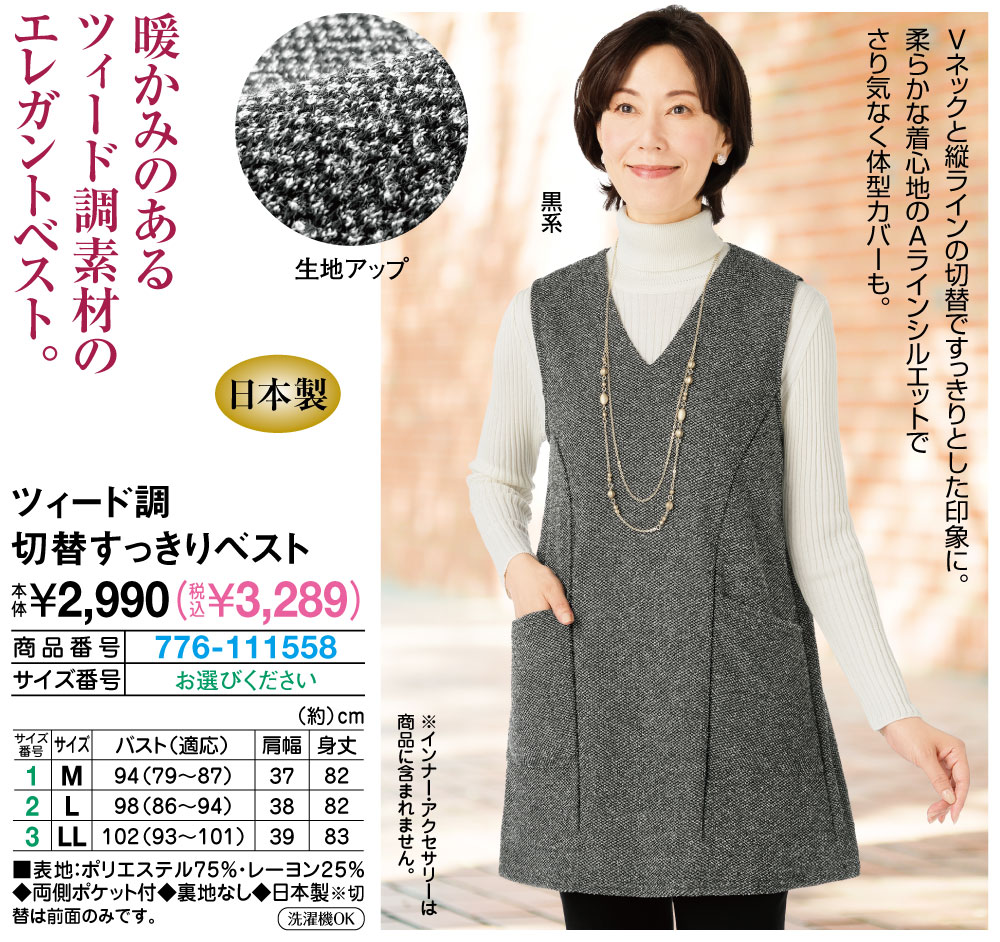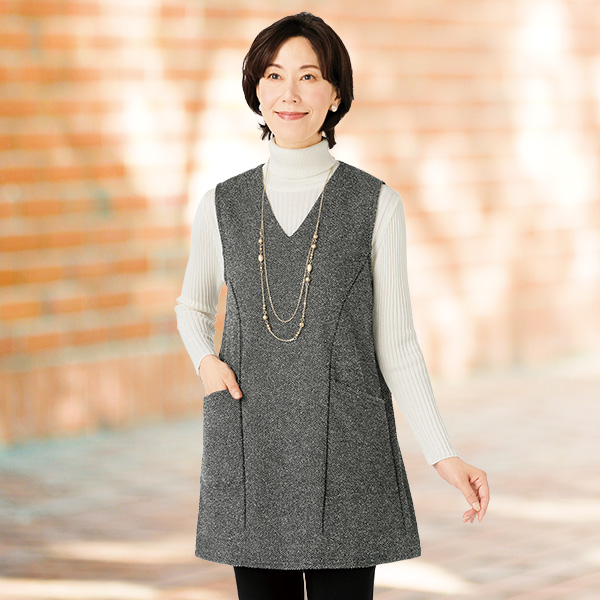 暖かみのあるツィード調素材のエレガントベスト! Vネックと縦ラインの切替ですっきりとした印象に。 柔らかな着心地のAラインシルエットでさり気なく体型カバーも。