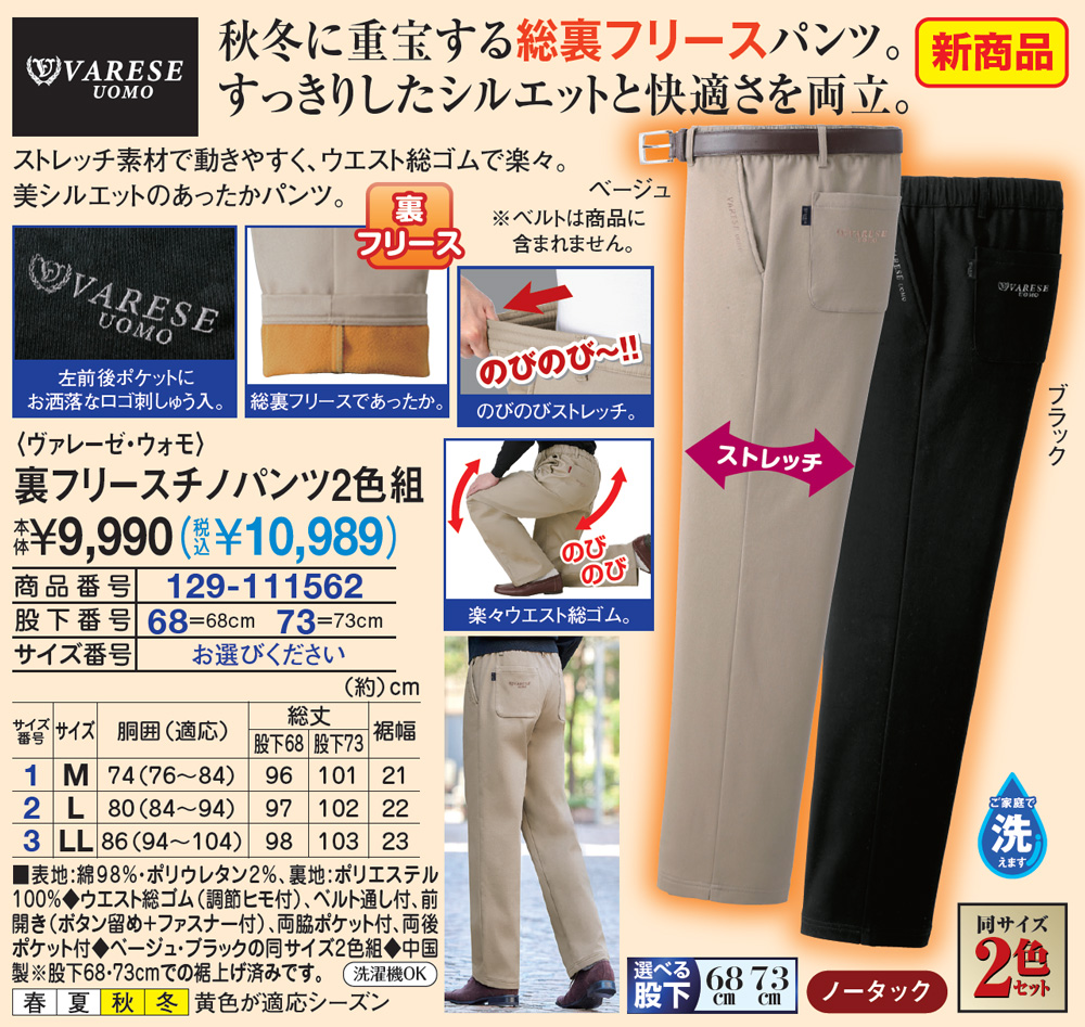 ヴァレーゼ・ウォモ 裏フリースチノパンツ2色組