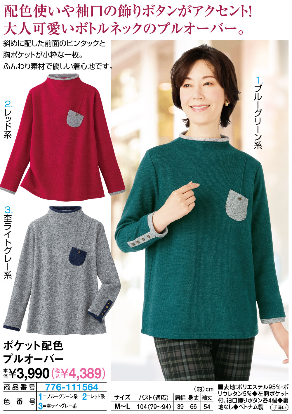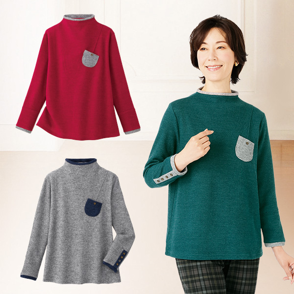 配色使いや袖口の飾りボタンがアクセント!大人可愛いボトルネックのプルオーバー! 斜めに配した前面のピンタックと胸ポケットが小粋な一枚。 ふんわり素材で優しい着心地です。