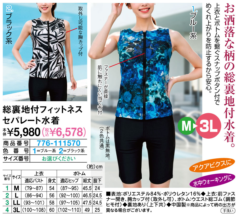 お洒落な柄の総裏地付水着! 上衣とボトムを繋ぐスナップボタン付でめくれ上がりを防止するから安心。 ファスナーが直接肌に触れにくい当て布付 取外し可能な胸カップ付 ボトムは黒無地。(2色共通) ●アクアビクスに ●水中ウォーキングに ●M~3L