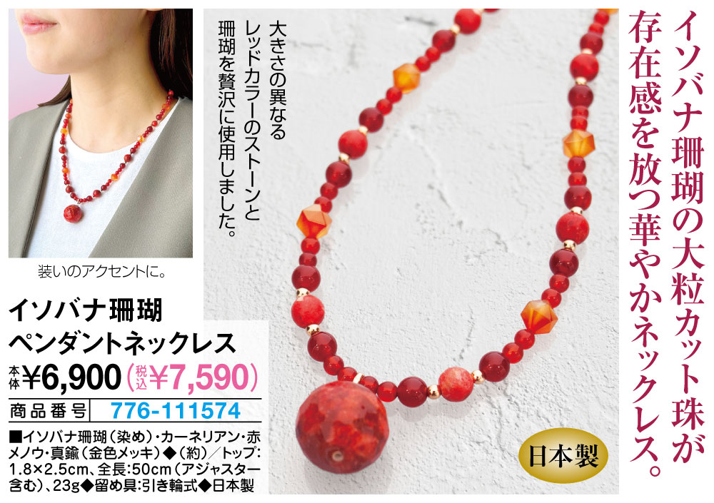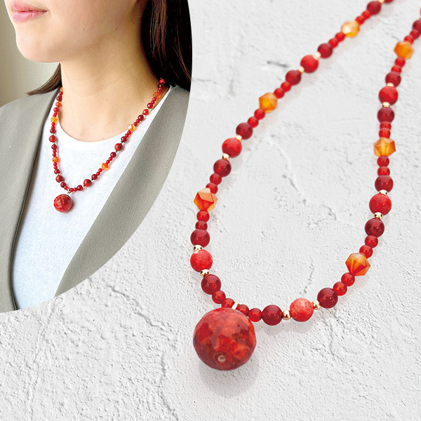 イソバナ珊瑚の大粒カット珠が存在感を放つ華やかネックレス! 大きさの異なるレッドカラーのストーンと珊瑚を贅沢に使用しました。 装いのアクセントに。