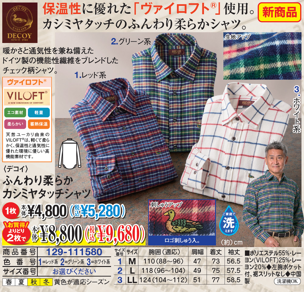 保温性に優れた「ヴァイロフト(R)」使用!カシミヤタッチのふんわり柔らかシャツ!