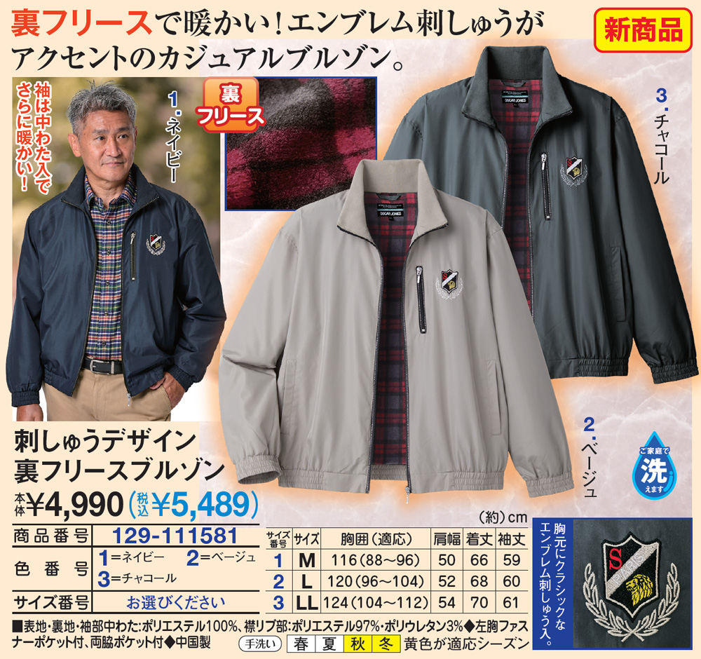 裏フリースで暖かい!エンブレム刺しゅうがアクセントのカジュアルブルゾン!
