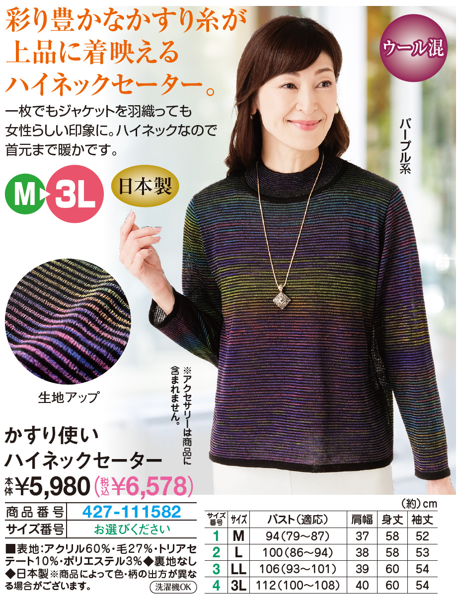 彩り豊かなかすり糸が上品に着映えるハイネックセーター。 一枚でもジャケットを羽織っても女性らしい印象に。 ハイネックなので首元まで暖かです。
