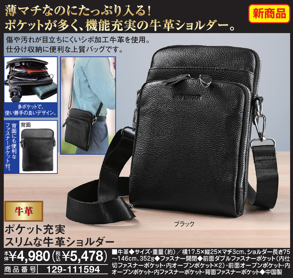 薄マチなのにたっぷり入る!ポケットが多く、機能充実の牛革ショルダー! 傷や汚れが目立ちにくいシボ加工牛革を使用。仕分け収納に便利な上質バッグです。 多ポケットで、使い勝手の良いデザイン。 背面にも便利なファスナーポケット付。 ●牛革