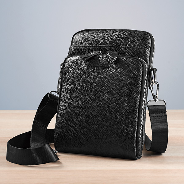 ■牛革 ◆サイズ・重量(約)/横17.5×縦25×マチ3cm、ショルダー長さ75~146cm、352g ◆ファスナー開閉 ◆前面ダブルファスナーポケット(内仕切ファスナーポケット・内オープンポケット×2)・前面オープンポケット・内オープンポケット・内ファスナーポケット・背面ファスナーポケット ◆中国製