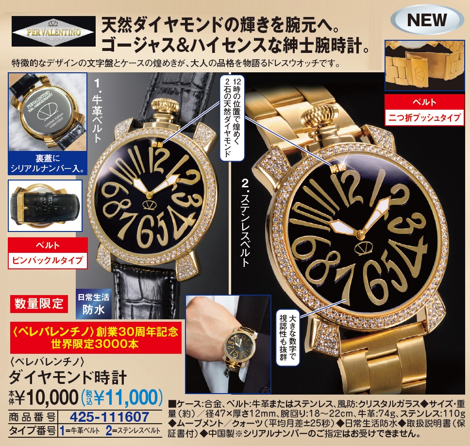 天然ダイヤモンドの輝きを腕元へ。ゴージャス&ハイセンスな紳士腕時計。 特徴的なデザインの文字盤とケースの煌めきが、大人の品格を物語るドレスウオッチです。 ■ペレバレンチノ 創業30周年記念世界限定3000本 ■日常生活防水
