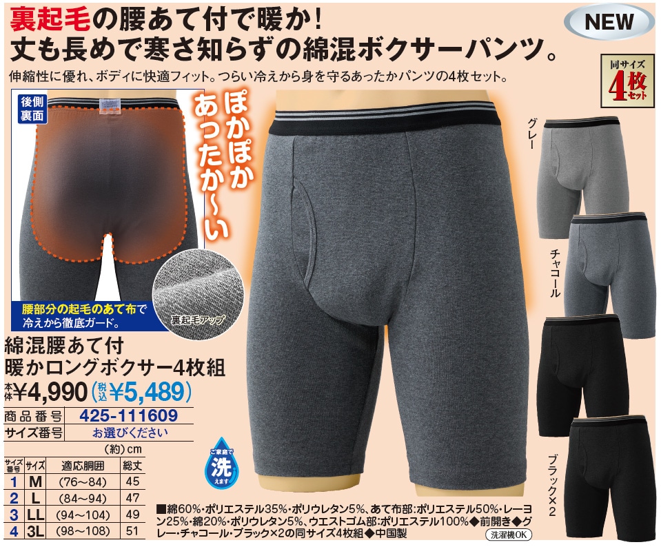 丈も長めで寒さ知らずの綿混ボクサーパンツ。