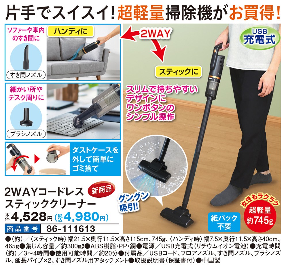 ●(約)/<スティック時>幅21.5×奥行11.5×高さ115cm、745g、<ハンディ時>幅7.5×奥行11.5×高さ40cm、465g ●集じん容量/約300ml ●ABS樹脂・PP・銅 ●電源/USB充電式(リチウムイオン電池) ●充電時間(約)/3~4時間 ●使用可能時間/約20分 ●付属品/USBコード、フロアノズル、すき間ノズル、ブラシノズル、延長パイプ×2、すき間ノズル用アタッチメント ●取扱説明書(保証書付) ●中国製