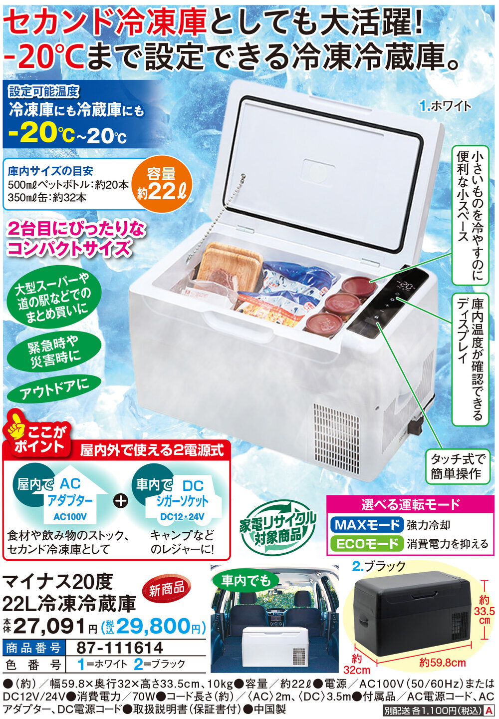 ・屋内でACアダプター(AC100V):食材や飲み物のストック、セカンド冷凍庫として