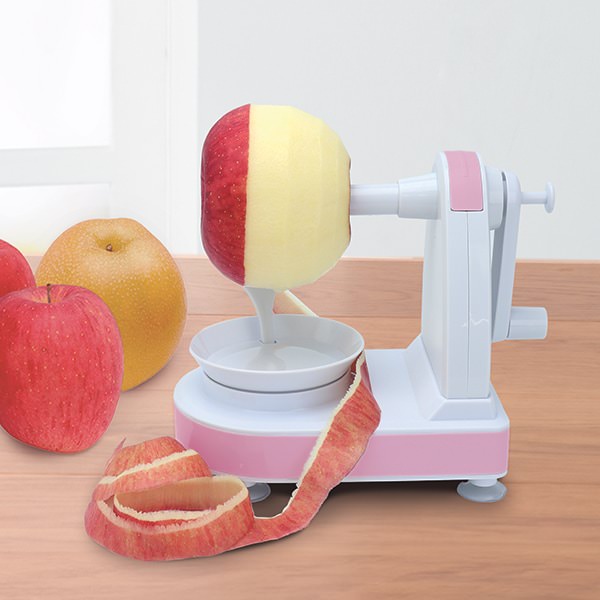 ハンドルを回すだけで皮むき完了! ●適応重量:約500gまで ●適応サイズ:直径約5~12cm ●りんごに ●梨に 固い柑橘の皮をむきやすくする皮むきリング付! ツメを刺して全体に切り込みを入れる。 切り込みに沿って簡単に皮が剥けます。