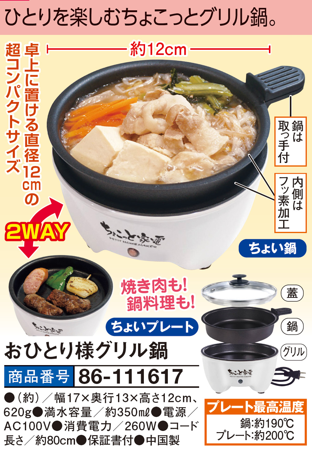 ひとりを楽むちょっとグリル鍋! 卓上に置ける直径12cmの超コンパクトサイズ 2WAY ●ちょいプレート ●ちょい鍋 焼き肉も!鍋料理も! 鍋は取っ手付 内側はフッ素加工 【プレート最高温度】 鍋:約190度 プレート:約200度