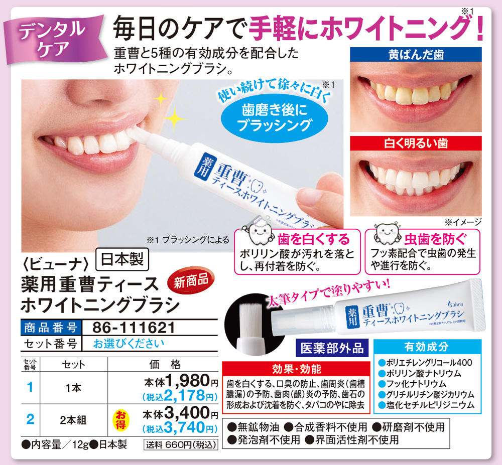 毎日のケアで手軽にホワイトニング※1! 【デンタルケア】 重曹と5種の有効成分を配合したホワイトニングブラシ。 使い続けて徐々に白く!歯磨き後にブラッシング 太筆タイプで塗りやすい! ●歯を白くする ポリリン酸が汚れを落とし、再付着を防ぐ。 ●虫歯を防ぐ フッ素配合で虫歯の発生や進行を防ぐ。 ●効果・効能: 歯を白くする、口臭の防止、歯周炎(歯槽膿漏)の予防、歯肉(齦)炎の予防、歯石の形成および沈着を防ぐ、タバコのやに除去。 ●有効成分: ポリエチレングリコール400、ポリリン酸ナトリウム、フッ化ナトリウム、グリチルリチン酸ジカリウム、塩化セチルピリジニウム 医薬部外品 ●無鉱物油 ●合成香料不使用 ●研磨剤不使用 ●発泡剤不使用 ●界面活性剤不使用