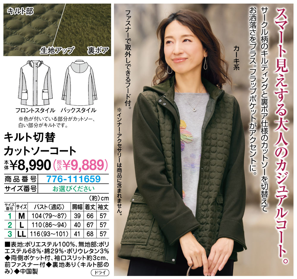 【サイズ(約)】 バスト(適応)、肩幅、着丈、袖丈 <M>104(79~87)cm、39cm、66cm、57cm <L>110(86~94)cm、40cm、67cm、57cm <LL>116(93~101)cm、41cm、68cm、57cm ■表地:ポリエステル100%、無地部:ポリエステル68%・綿29%・ポリウレタン3% ◆両側ポケット付、袖口スリット約3cm、前ファスナー付 ◆裏地あり(キルト部のみ) ◆中国製