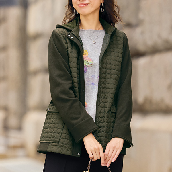 スマート見えする大人のカジュアルコート! サークル柄のキルティングと裏ボア仕様のカットソーを切替えてお洒落さをプラス。 フラップポケットがアクセントに。 ファスナーで取外しできるフード付。
