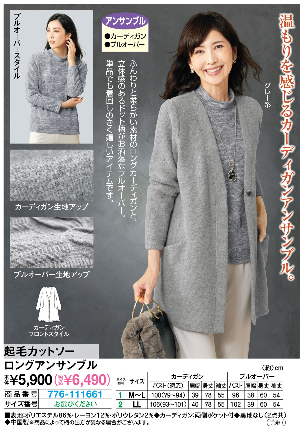 カーディガン【サイズ(約)】 バスト(適応)、肩幅、身丈、袖丈 <M〜L>100(79〜94)cm、39cm、78cm、55cm <LL>106(93〜101)cm、40cm、78cm、55cm プルオーバー【サイズ(約)】 バスト、肩幅、身丈、袖丈 <M〜L>96cm、38cm、60cm、54cm <LL>102cm、39cm、60cm、54cm ■表地:ポリエステル86%・レーヨン12%・ポリウレタン2% ◆カーディガン:両側ポケット付 ◆裏地なし(2点共) ◆中国製