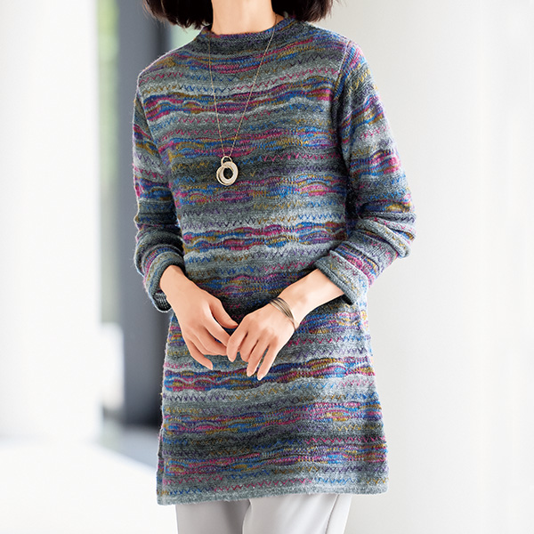 きれいな色を効かせたかすり糸を使ってふんわりと編み上げた立体感のあるウェーブ柄が印象的。