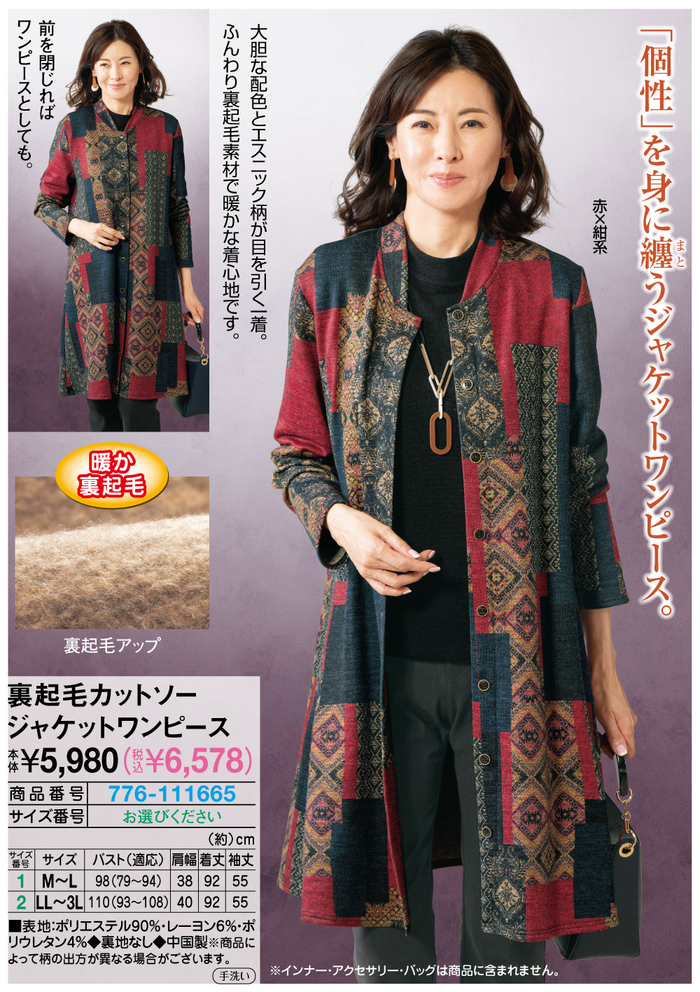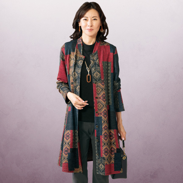 「個性」を身に纏うジャケットワンピース! 大胆な配色とエスニック柄が目を引く一着。 ふんわり裏起毛素材で暖かな着心地です。 前を閉じればワンピースとしても。 ●暖か裏起毛