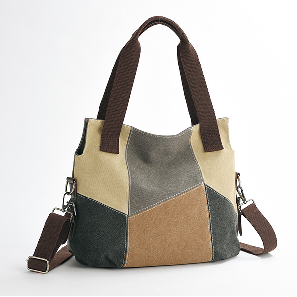 パネル切替がお洒落な2WAYバッグ! しっかりとした綿のキャンバス地をマルチカラーでパッチワーク風に切替えました。 マチが広く、たっぷり収納なのも魅力の一つ。 取外せるショルダーベルト付で斜め掛けもOK。 便利な背面ポケット付。 ●2way