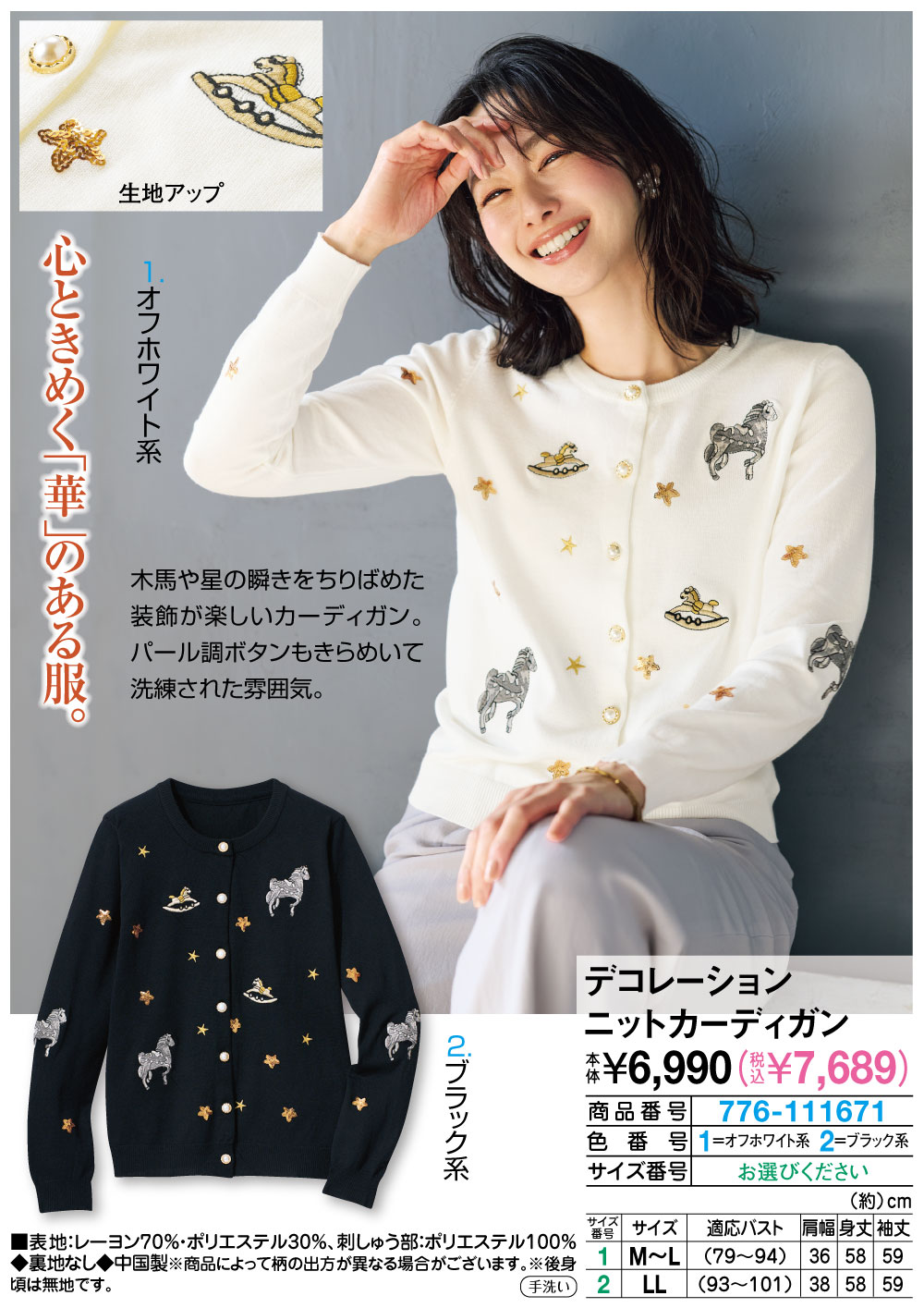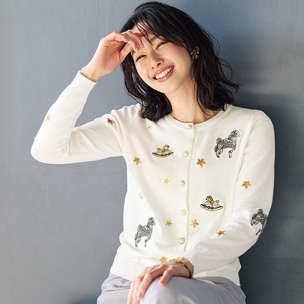 心ときめく「華」のある服! 木馬や星の瞬きをちりばめた装飾が楽しいカーディガン。 パール調ボタンもきらめいて洗練された雰囲気。