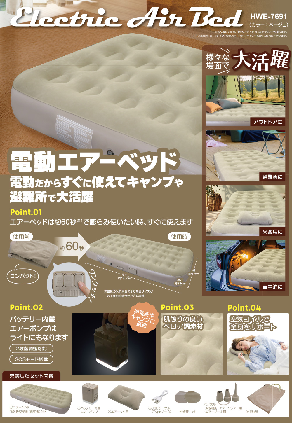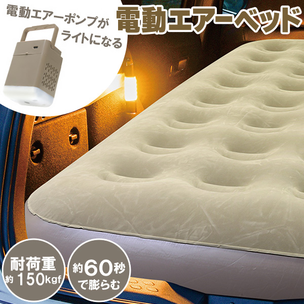 わずか60秒でふくらむ電動エアベッド! ボタン一つで「空気入れ&空気抜き」ができる! 肌ざわりの良いフロック生地でやさしい寝心地♪ バッテリー内蔵エアーポンプ 取外してライトとして使えます。SOSモード搭載。