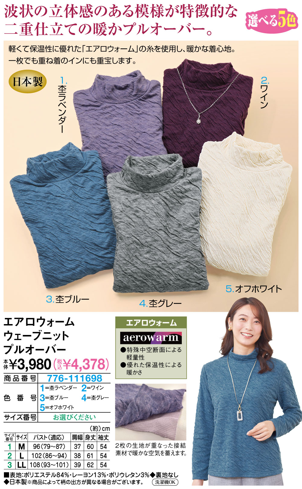 軽くて保温性に優れた「エアロウォーム」の糸を使用し、暖かな着心地。