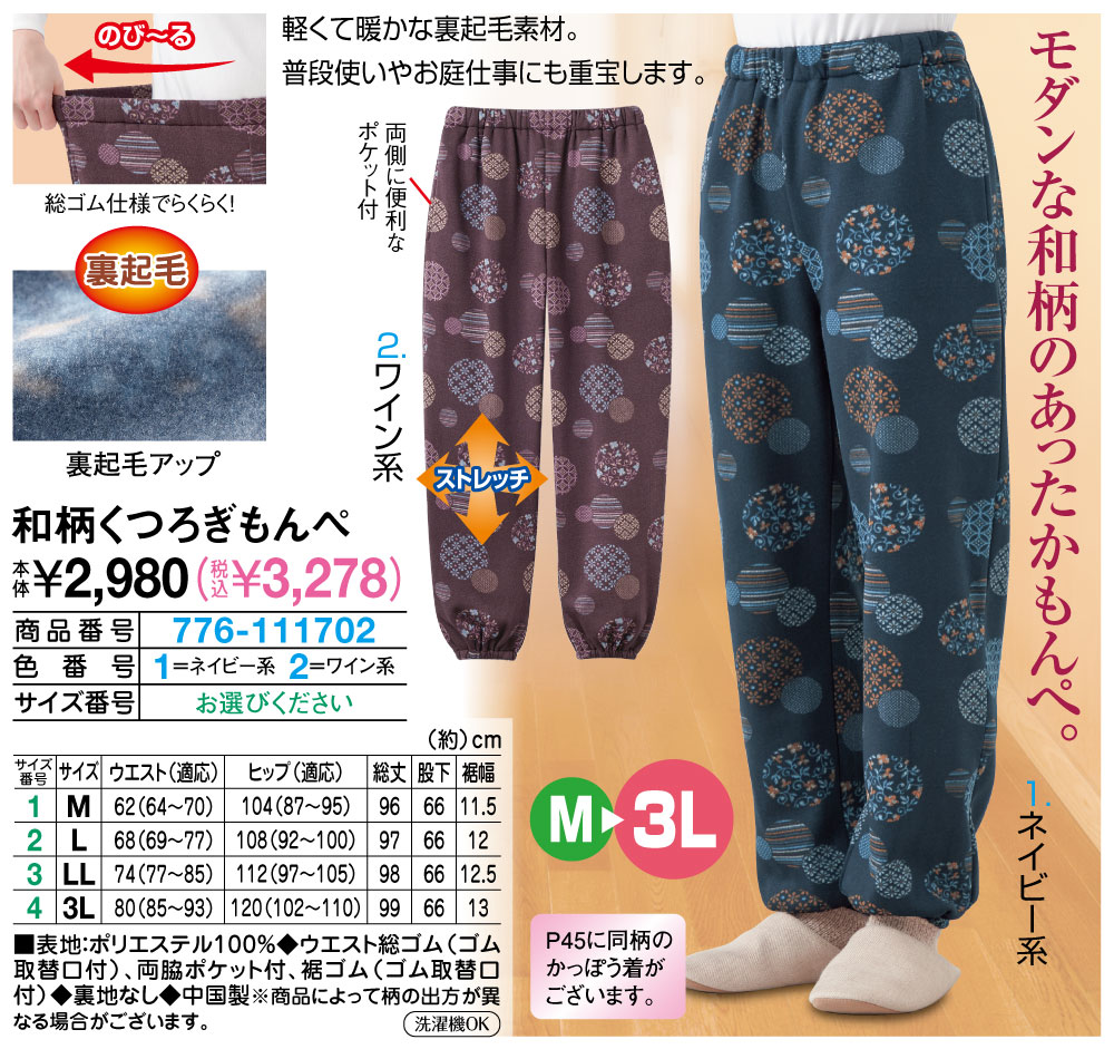 【サイズ(約)】 ウエスト(適応)、ヒップ(適応)、総丈、股下、裾幅 <M>62(64~70)cm、104(87~95)cm、96cm、66cm、11.5cm <L>68(69~77)cm、108(92~100)cm、97cm、66cm、12cm <LL>74(77~85)cm、112(97~105)cm、98cm、66cm、12.5cm <3L>80(85~93)cm、120(102~110)cm、99cm、66cm、13cm ■表地:ポリエステル100% ◆ウエスト総ゴム(ゴム取替口付)、両脇ポケット付、裾ゴム(ゴム取替口付) ◆裏地なし ◆中国製
