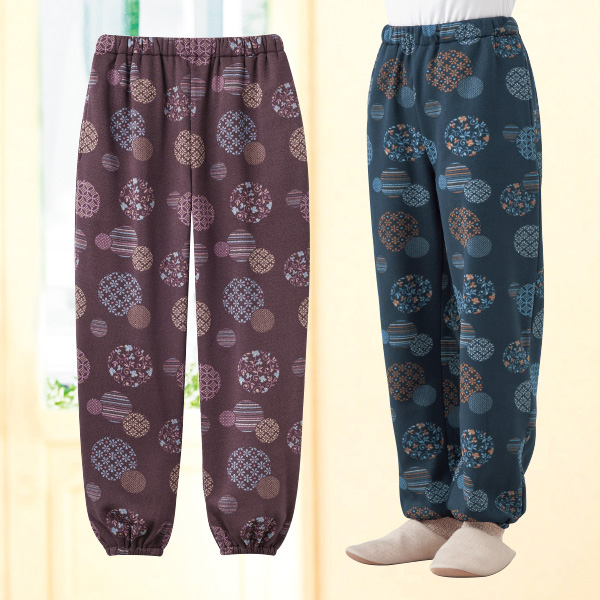 モダンな和柄のあったかもんぺ! 普段使いやお庭仕事にも重宝します。 軽くて暖かな裏起毛素材。 両側に便利なポケット付 総ゴム仕様でらくらく! ●ストレッチ ●裏起毛 ●M~3L