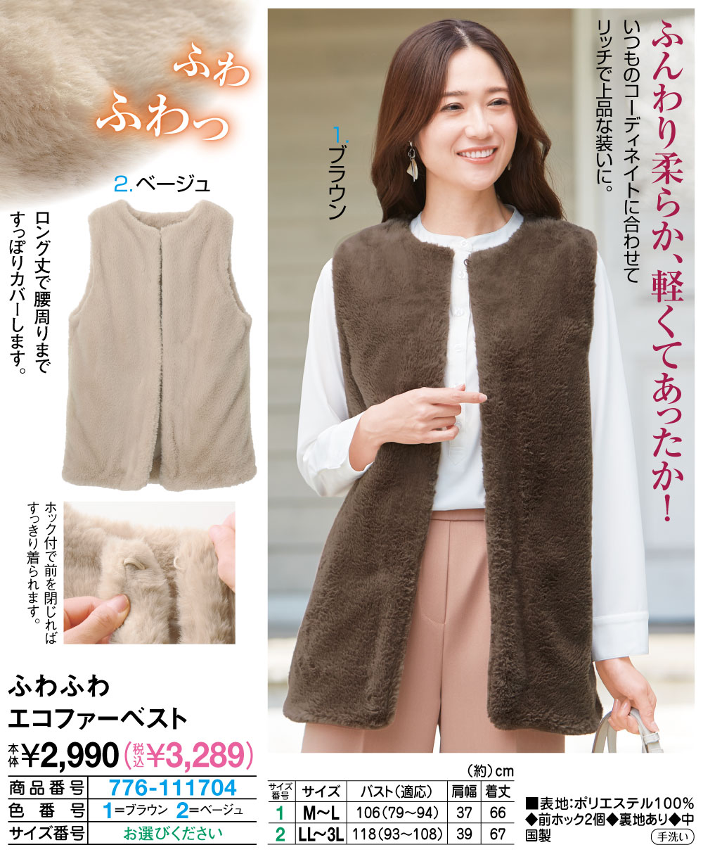 【サイズ(約)】 バスト(適応)、肩幅、着丈 <M~L>106(79~94)cm、37cm、66cm <LL~3L>118(93~108)cm、39cm、67cm ■表地:ポリエステル100% ◆前ホック2個 ◆裏地あり ◆中国製