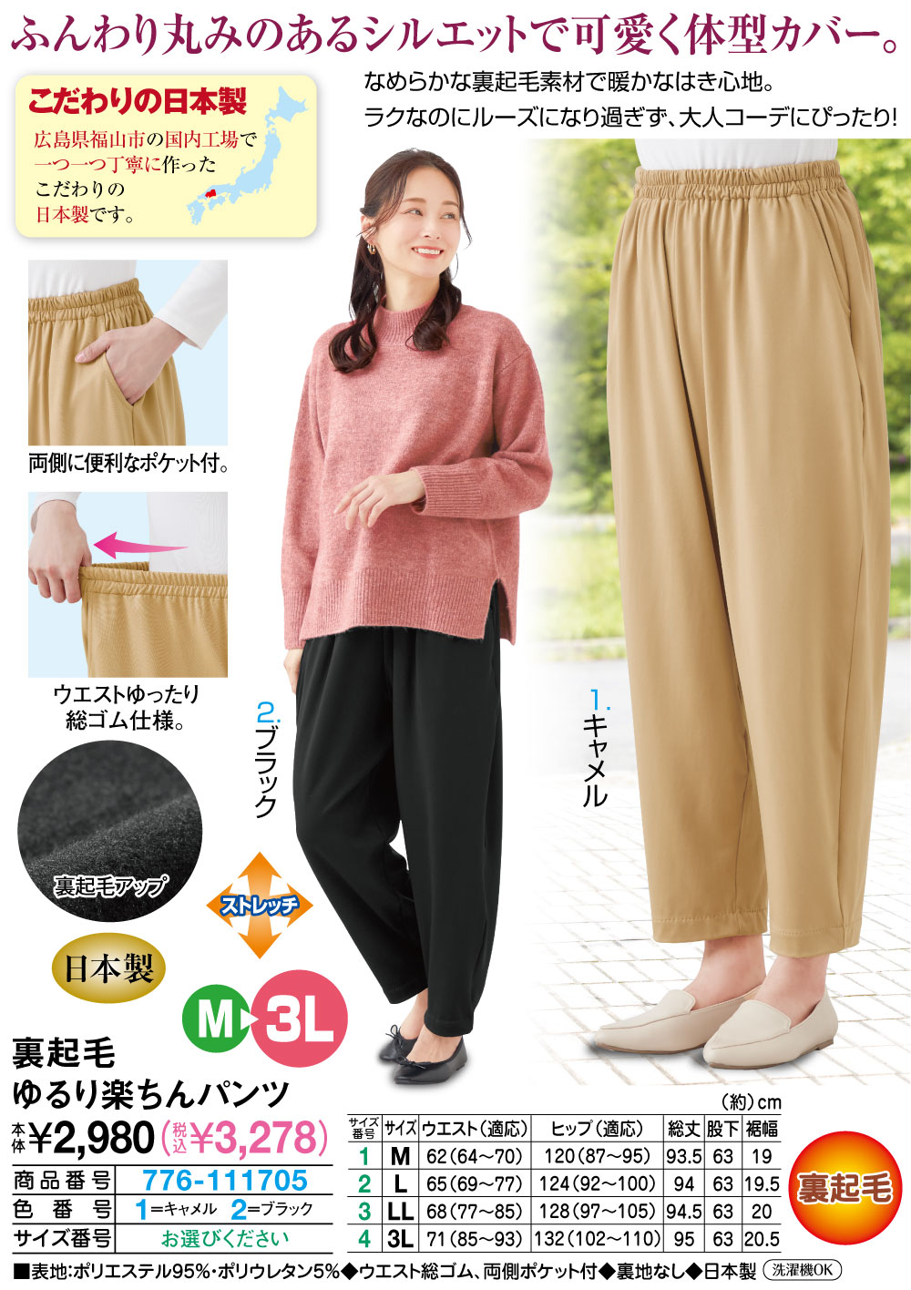 ウエスト(適応)、ヒップ(適応)、総丈、股下、裾幅