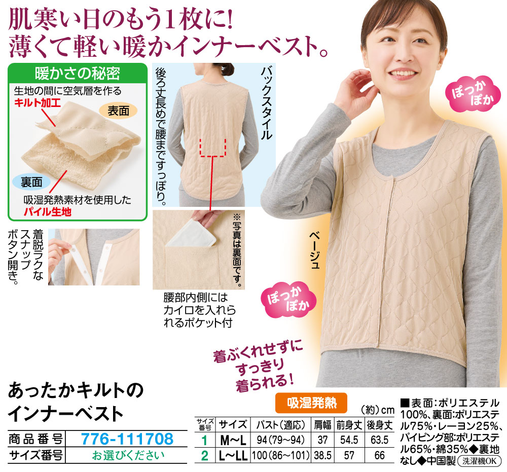 肌寒い日のもう1枚に!薄くて軽い暖かインナーベスト! 着ぶくれせずにすっきり着られる! 後ろ丈長めで腰まですっぽり。 腰部内側にはカイロを入れられるポケット付 着脱ラクなスナップボタン開き。 【暖かさの秘密】 (表面)生地の間に空気層を作るキルト加工 (裏面)吸湿発熱素材を使用したパイル生地 ●吸湿発熱