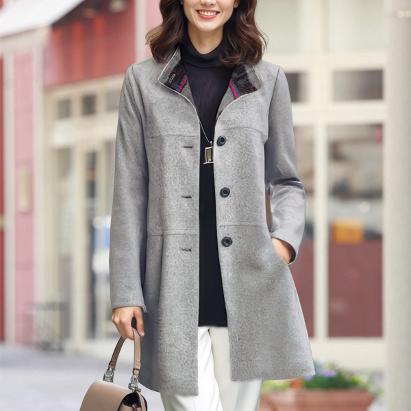 ウール混素材で暖かく、洗練された印象の高級感あふれるスタンド衿コート!