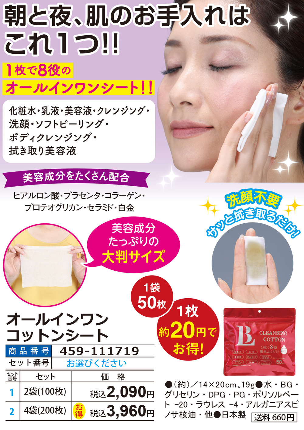 ●1枚で8役のオールインワンシート!! ●化粧水・乳液・美容液・クレンジング・洗顔・ソフトピーリング・ボディクレンジング・拭き取り美容液 ●美容成分をたくさん配合 ヒアルロン酸・プラセンタ・コラーゲン・プロテオグリカン・セラミド・白金 ●美容成分たっぷりの大判サイズ ●洗顔不要:サッと拭き取るだけ! ●1袋50枚