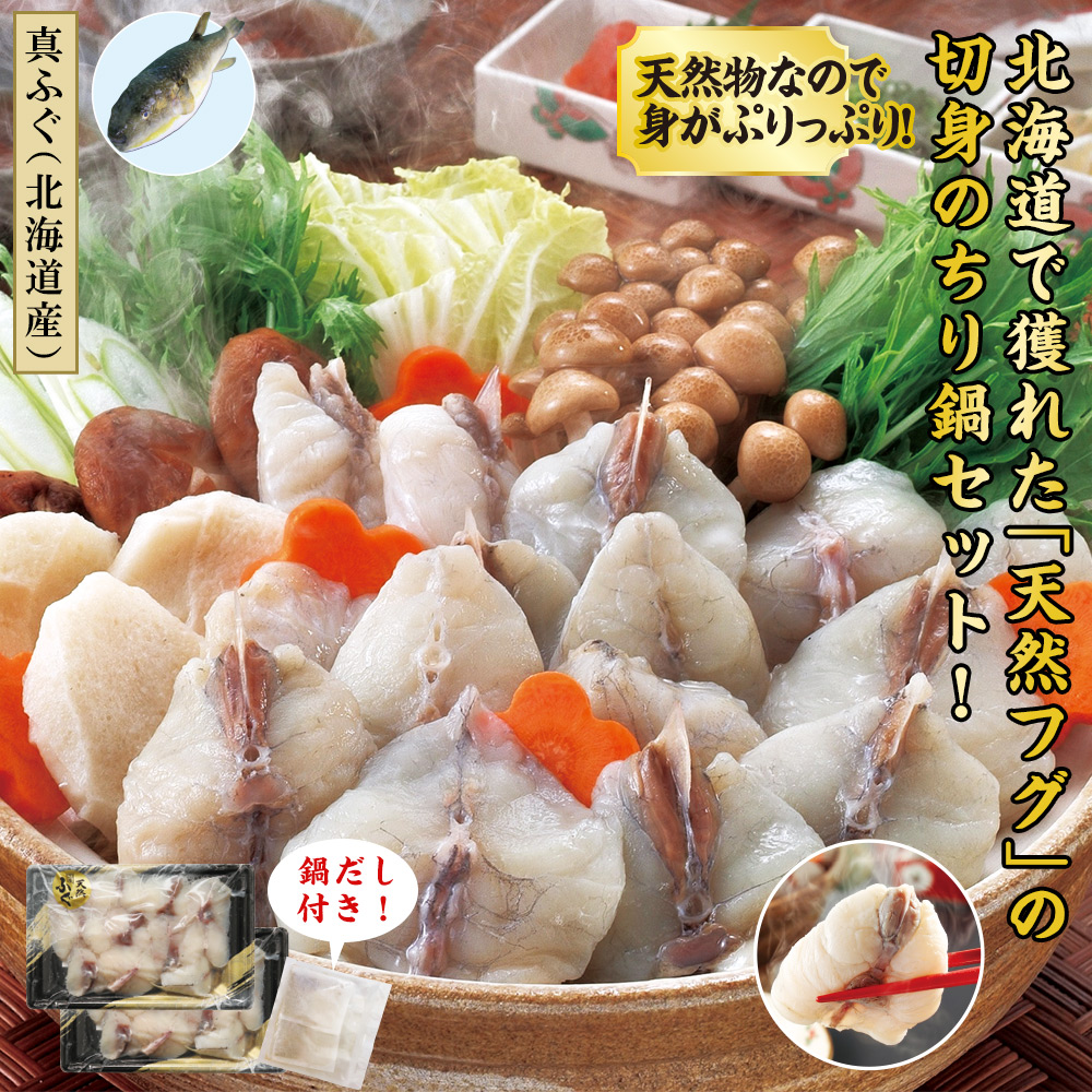 【真ふぐ(北海道産)】 天然物なので身がぷりっぷり! ふぐの一大消費地「大阪」で製造した「はぴねすくらぶ限定」の「ふぐ鍋セット」をお届けします。 切身は北海道産の「天然真フグ」を使用。ふぐ鍋はもちろん、焼きふぐなども楽しめます。