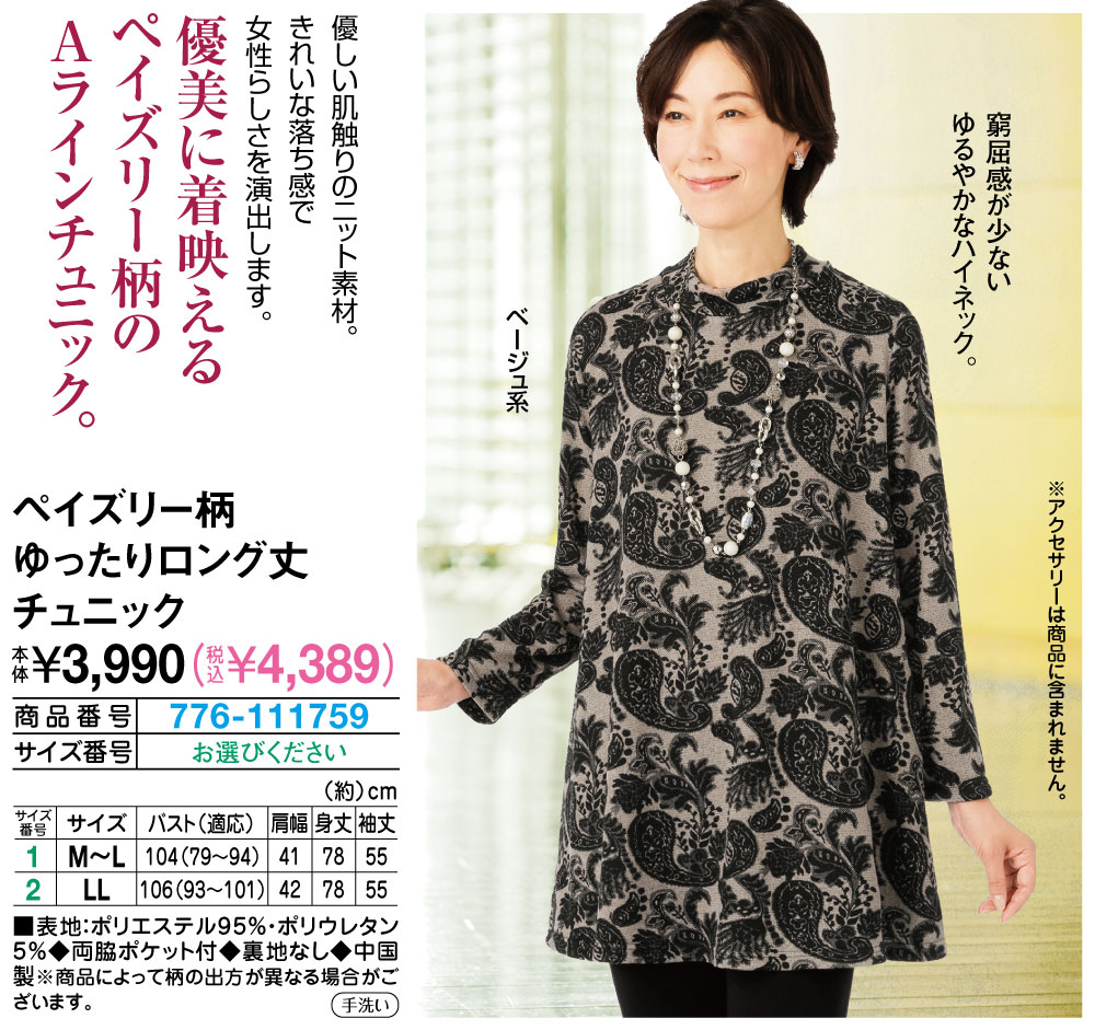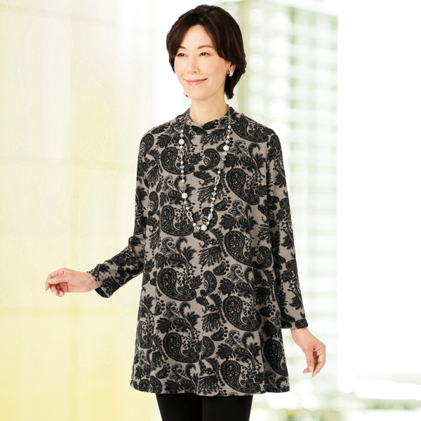 優美に着映えるペイズリー柄のAラインチュニック! 優しい肌触りのニット素材。 きれいな落ち感で女性らしさを演出します。 窮屈感が少ないゆるやかなハイネック。