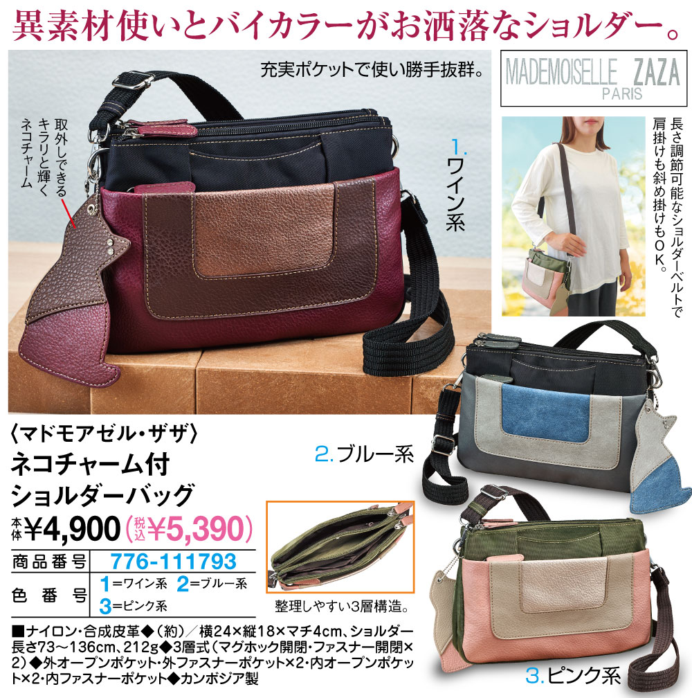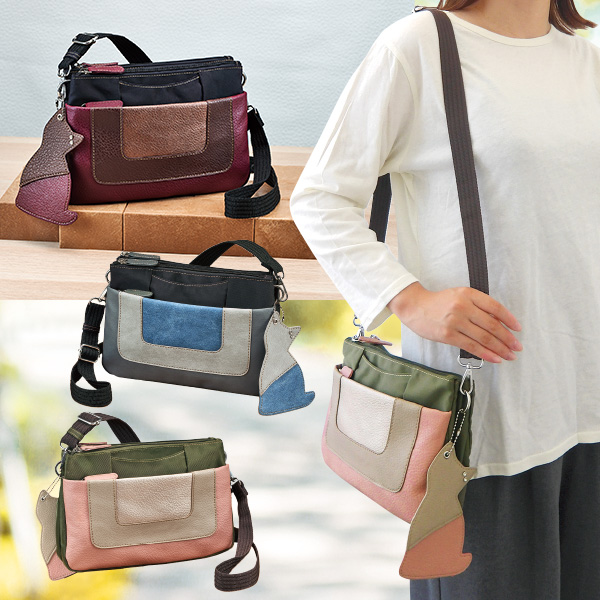 異素材使いとバイカラーがお洒落なショルダー! 充実ポケットで使い勝手抜群。 長さ調節可能なショルダーベルトで肩掛けも斜め掛けもOK。 取外しできるキラリと輝くネコチャーム 整理しやすい3層構造。
