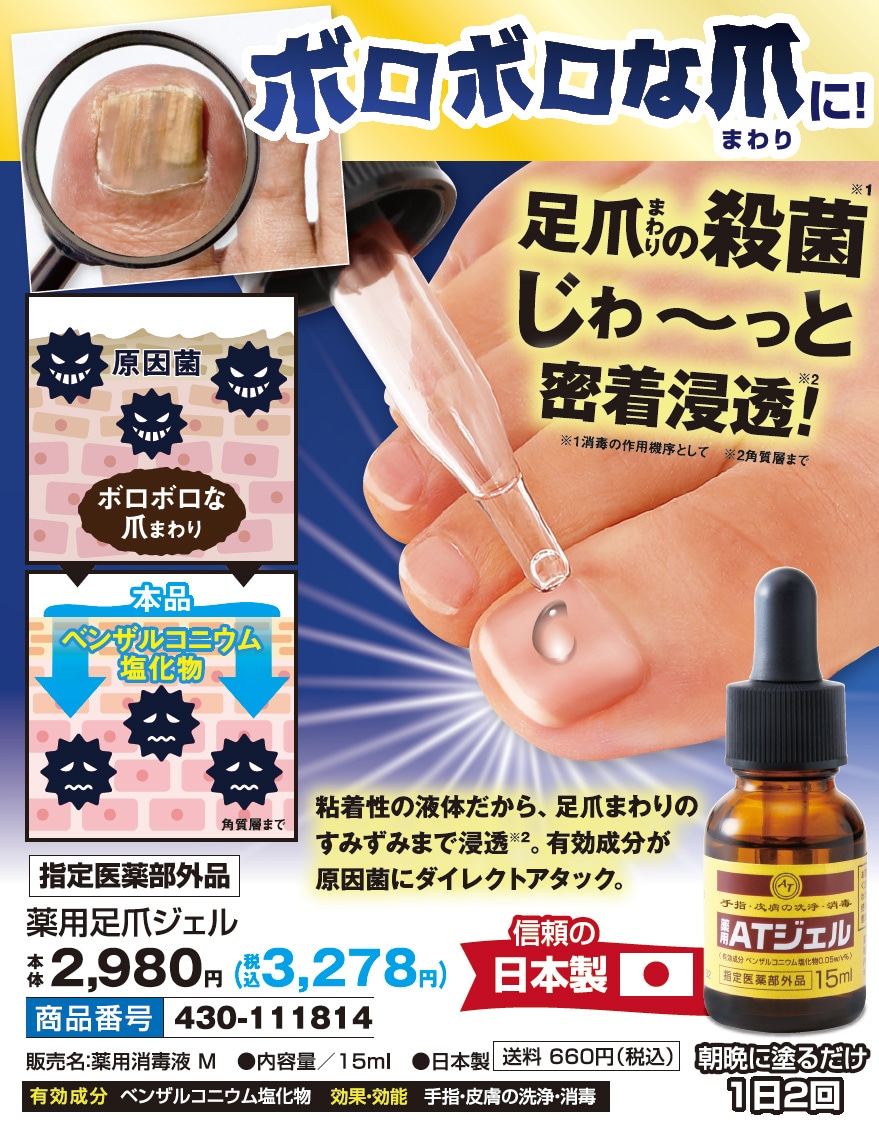 ボロボロな爪まわりに! 足爪まわりの殺菌(※1)じわ~っと密着浸透(※2)! 粘着性の液体だから、足爪まわりのすみずみまで浸透(※2)。有効成分が原因菌にダイレクトアタック。 朝晩に塗るだけ1日2回。 ■有効成分 ベンザルコニウム塩化物 ■効果・効能 手指・皮膚の洗浄・消毒 ■指定医薬部外品 ※1消毒の作用機序として ※2角質層まで