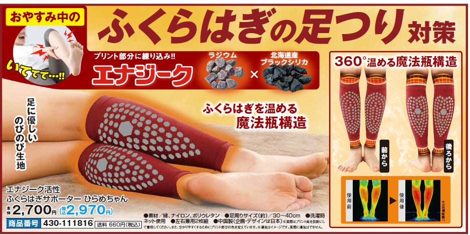 おやすみ中のふくらはぎの足つり対策。 360度温める魔法瓶構造。 プリント部分に練り込み!エナジーク。 ラジウム×北海道産ブラックシリカ。 ふくらはぎを温める魔法瓶構造。