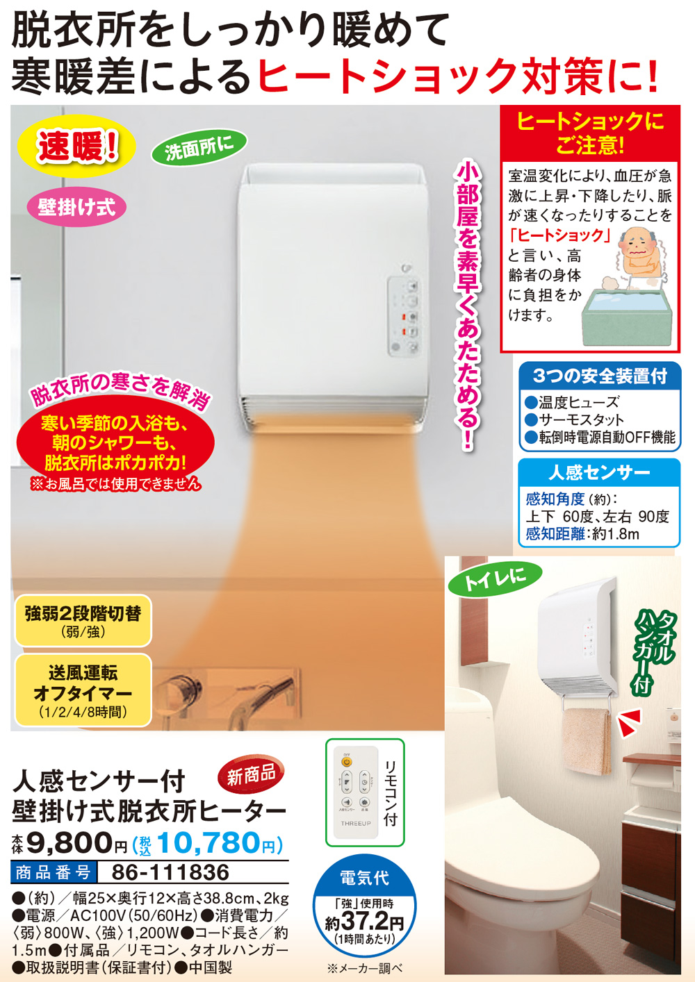 脱衣所をしっかり暖めて寒暖差によるヒートショック対策に! 脱衣所の寒さを解消 寒い季節の入浴も、朝のシャワーも、脱衣所はポカポカ! ※お風呂では使用できません 小部屋を素早くあたためる! 【ヒートショックにご注意!】 室温変化により、血圧が急激に上昇・下降したり、脈が速くなったりすることを「ヒートショック」と言い、高齢者の身体に負担をかけます。 ●速暖! ●壁掛け式 ●リモコン付 ●タオルハンガー付 ●強弱2段階切替(弱/強) ●送風運転オフタイマー(1/2/4/8時間) 洗面所に トイレに 【人感センサー】 感知角度(約):上下60度、左右90度 感知距離:約1.8m 【電気代】 「強」使用時37.2円(1時間あたり) ※メーカー調べ 【3つの安全装置付】 ●温度ヒューズ ●サーモスタット ●転倒時電源自動OFF機能
