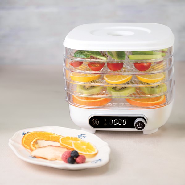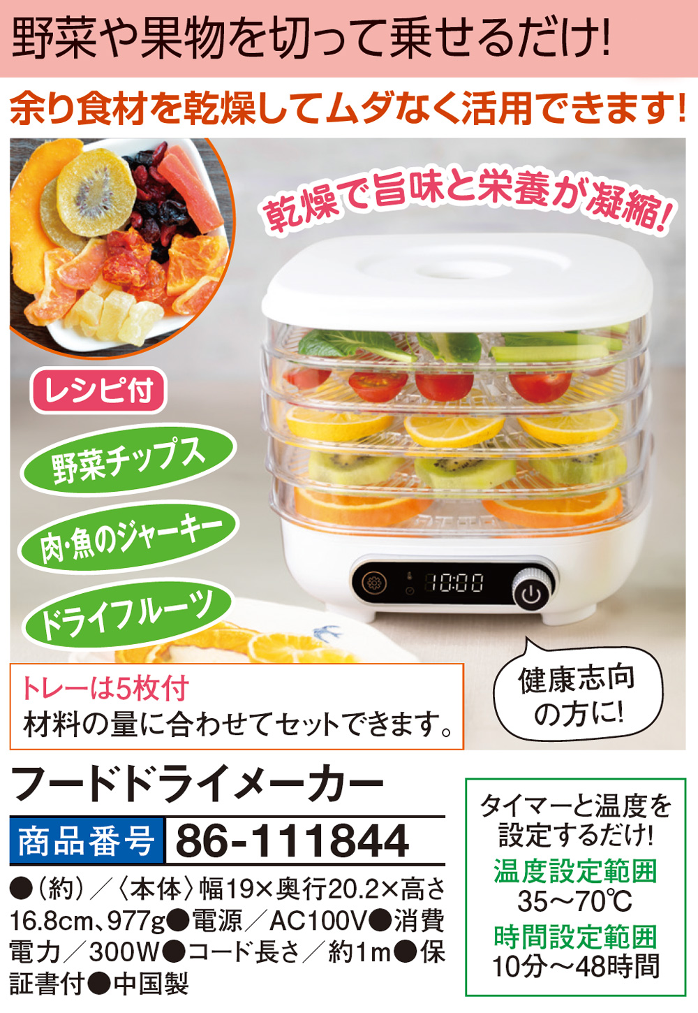 野菜や果物を切って乗せるだけ! 余り食材を乾燥してムダなく活用できます! 乾燥で旨味と栄養が凝縮! 健康志向の方に! タイマーと温度を設定するだけ! 温度設定範囲35~70度 時間設定範囲10分~48時間 トレーは5枚付 材料の量に合わせてセットできます。 ●レシピ付 ●野菜チップス ●肉・魚のジャーキー ●ドライフルーツ