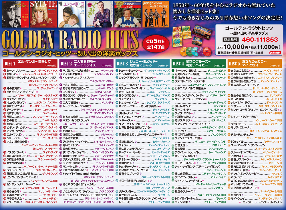 1950年~60年代を中心にラジオから流れていた懐かしき想い出の洋楽ヒット集! 今でもTVCMや番組、映画、ドラマでも使われている聴きなじみの曲を147曲も収録!