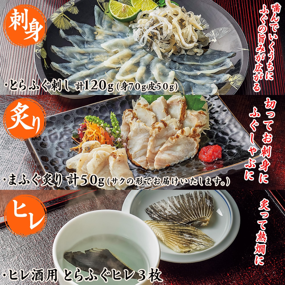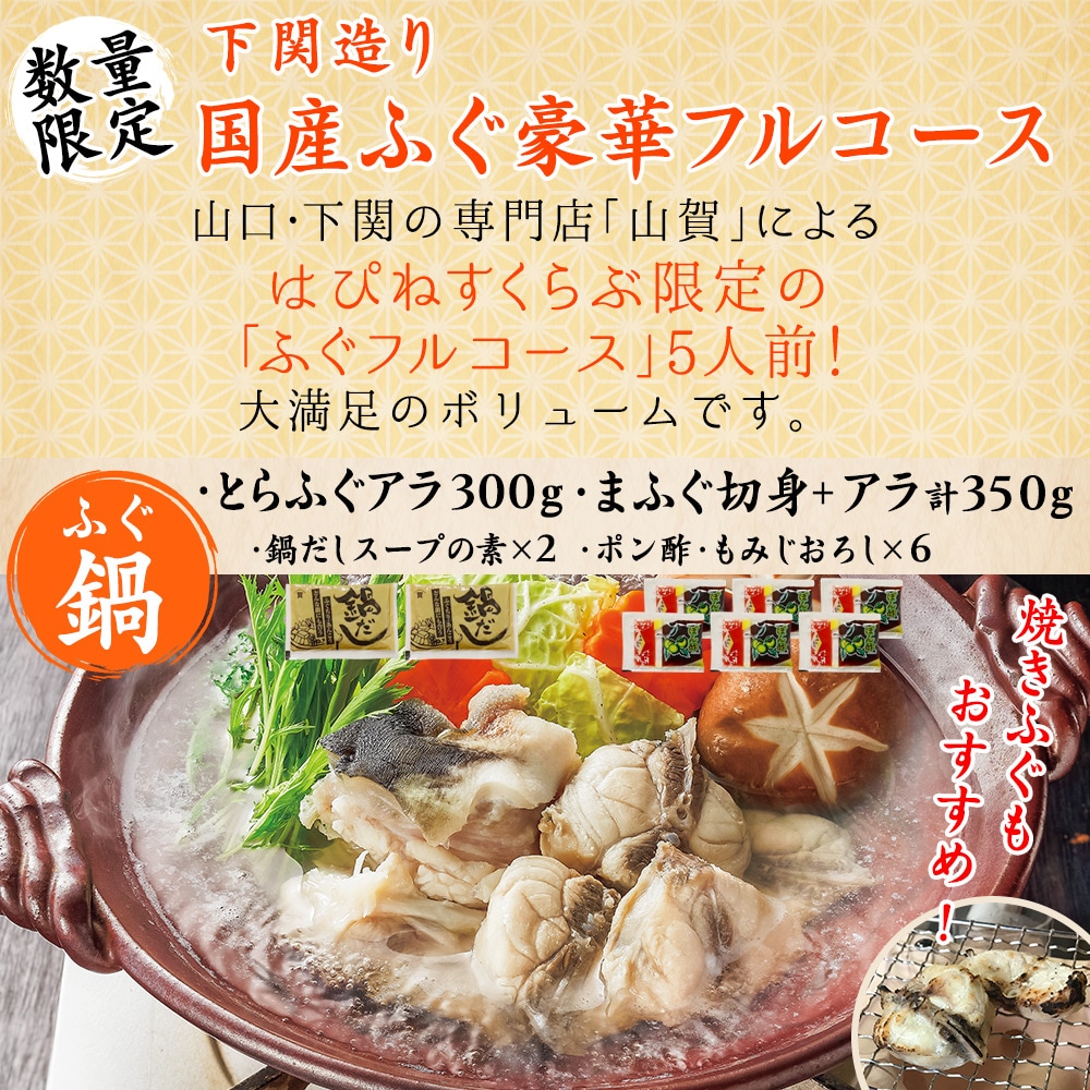 山口・下関の専門店「山賀」によるはぴねすくらぶ限定の「とらふぐフルコース」5人前、大満足のボリュームです。 <刺身>「薄造り」[1]直径22cmのプラスチックの皿1枚に35g。[2]皮刺し:25gを皿1枚。オマケでさらに1枚。 <ふぐ鍋>[3]とらふぐアラ:300g[4]まふぐ切り身+アラ:350g[5]ポン酢:6袋[6]もみじおろし:6袋[7]スープの素:55g×2 <ふぐ炙り>[8]サクの形でお届け。50g切ってお刺身に、ふぐしゃぶに。 <ふぐヒレ>[9]ヒレ酒用とらふぐヒレ3枚