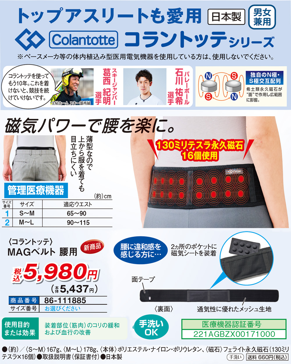磁気パワーで腰を楽に! 【トップアスリートも愛用】 コラントッテ(Colantotte)シリーズ ・バレーボール選手 石川祐希選手 ・スキージャンパー選手 葛西紀明選手(土屋ホーム スキー部所属) コラントッテを使ってもう10年。これを着けないと、競技を続けていけないです。 独自のN極・S極交互配列 希土類永久磁石が“面”で作用し広範囲に影響。 ●男女兼用 ●管理医療機器 薄型なので上から服を着ても目立ちにくい 130ミリテスラ永久磁石16個使用 ●腰に違和感を感じる方に… 2ヵ所のポケットに磁気シートを装着 ・通気性に優れたメッシュ生地 ◆医療機器認証番号:221AGBZX00171000 【使用目的または効果】 装着部位(筋肉)のコリの緩和および血行の改善