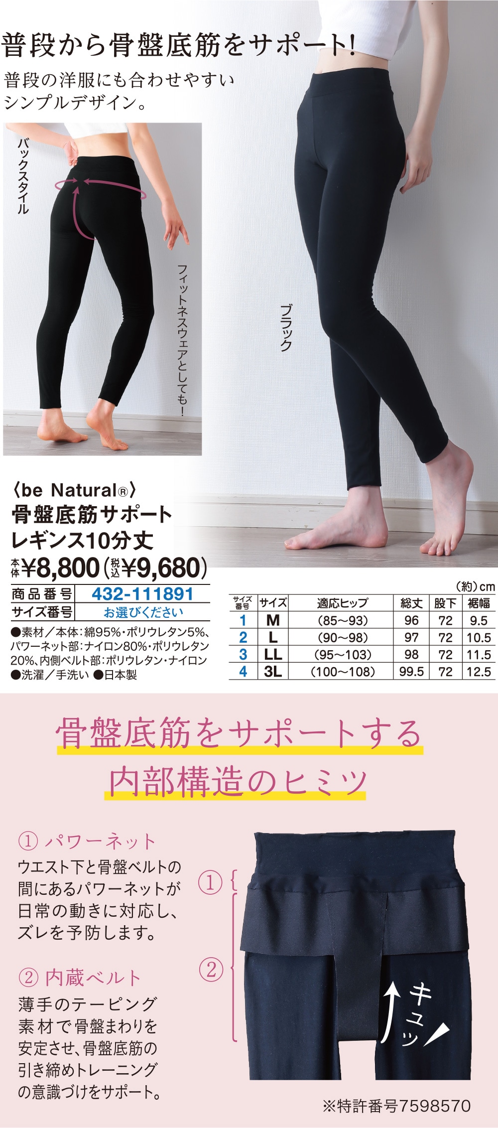 【骨盤底筋をサポートする内部構造のヒミツ】 1.パワーネット ウエスト下と骨盤ベルトの間にあるパワーネットが日常の動きに対応し、ズレを予防します。 2.内蔵ベルト 薄手のテーピング素材で骨盤まわりを安定させ、骨盤底筋の引き締めトレーニングの意識づけをサポート。 ◎普段の洋服にも合わせやすいシンプルデザイン。 ◎フィットネスウェアとしても!