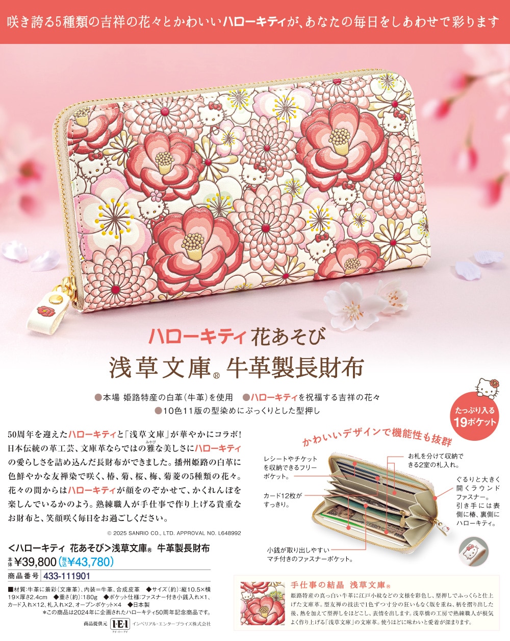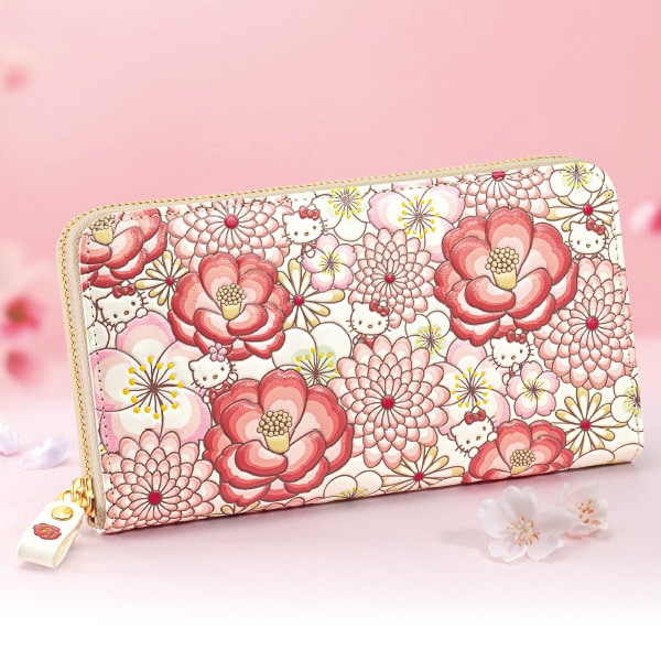 咲き誇る5種類の吉祥の花々とかわいいが、あなたの毎日をしあわせで彩ります。 50周年を迎えたハローキティと「浅草文庫」が華やかにコラボ! 日本伝統の革工芸、文庫革ならではの雅な美しさにハローキティの愛らしさを詰め込んだ長財布ができました。 播州姫路の白革に色鮮やかな友禅染で咲く、椿、菊、桜、梅、菊菱の5種類の花々。 花々の間からはハローキティが顔をのぞかせて、かくれんぼを楽しんでいるかのよう。 熟練職人が手仕事で作り上げる貴重なお財布と、笑顔咲く毎日をお過ごしください。 ●本場 姫路特産の白革(牛革)を使用 ●ハローキティを祝福する吉祥の花々 ●10色11版の型染めにぷっくりとした型押し