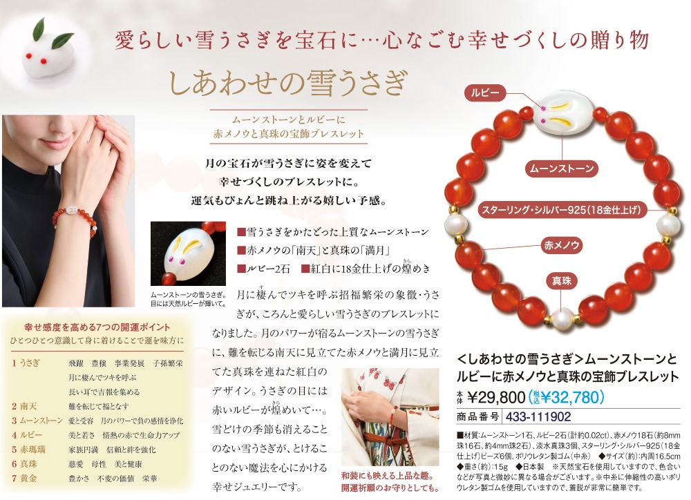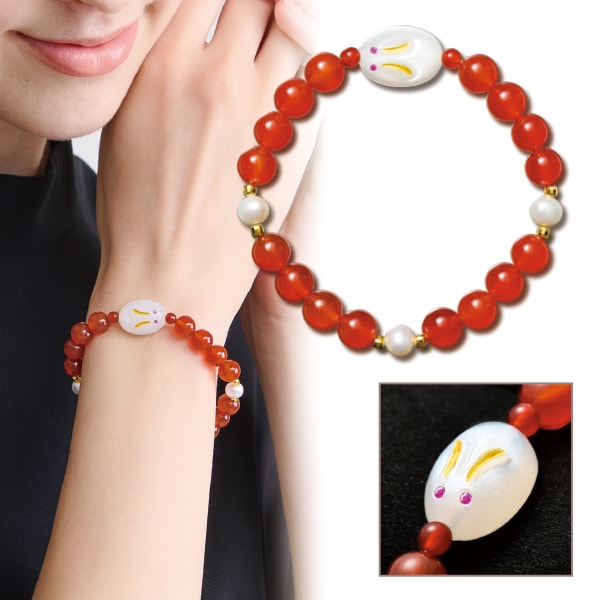 月の宝石が雪うさぎに姿を変えて幸せづくしのブレスレットに。 運気もぴょんと跳ね上がる嬉しい予感。 ■雪うさぎをかたどった上質なムーンストーン ■赤メノウの「南天」と真珠の「満月」 ■ルビー2石 ■紅白に18金仕上げの煌めき 和装にも映える上品な趣。 開運祈願のお守りとしても。