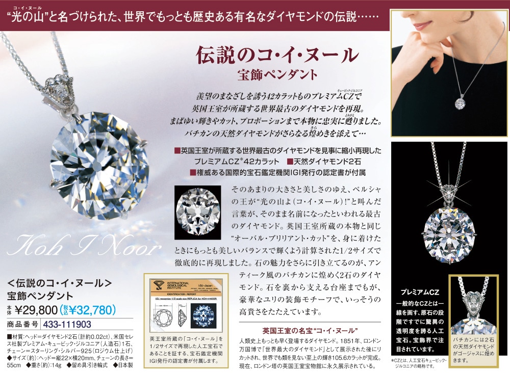 羨望のまなざしを誘う42カラットものプレミアムCZで英国王室が所蔵する世界最古のダイヤモンドを再現。 まばゆい輝きやカット、プロポーションまで本物に忠実に甦りました。 バチカンの天然ダイヤモンドがさらなる煌めきを添えて・・・ ■英国王室が所蔵する世界最古のダイヤモンドを見事に縮小再現したプレミアムCZ*42カラット ■天然ダイヤモンド2石 ■権威ある国際的宝石鑑定機関IGI発行の認定書が付属 【英国王室の名宝 コ・イ・ヌール】 人類史上もっとも早く登場するダイヤモンド。 1851年、ロンドン万国博で「世界最大のダイヤモンド」として展示された後にリカットされ、世界でも類を見ない至上の輝き105.6カラットが完成。 現在、ロンドン塔の英国王室宝物館に永久展示されている。