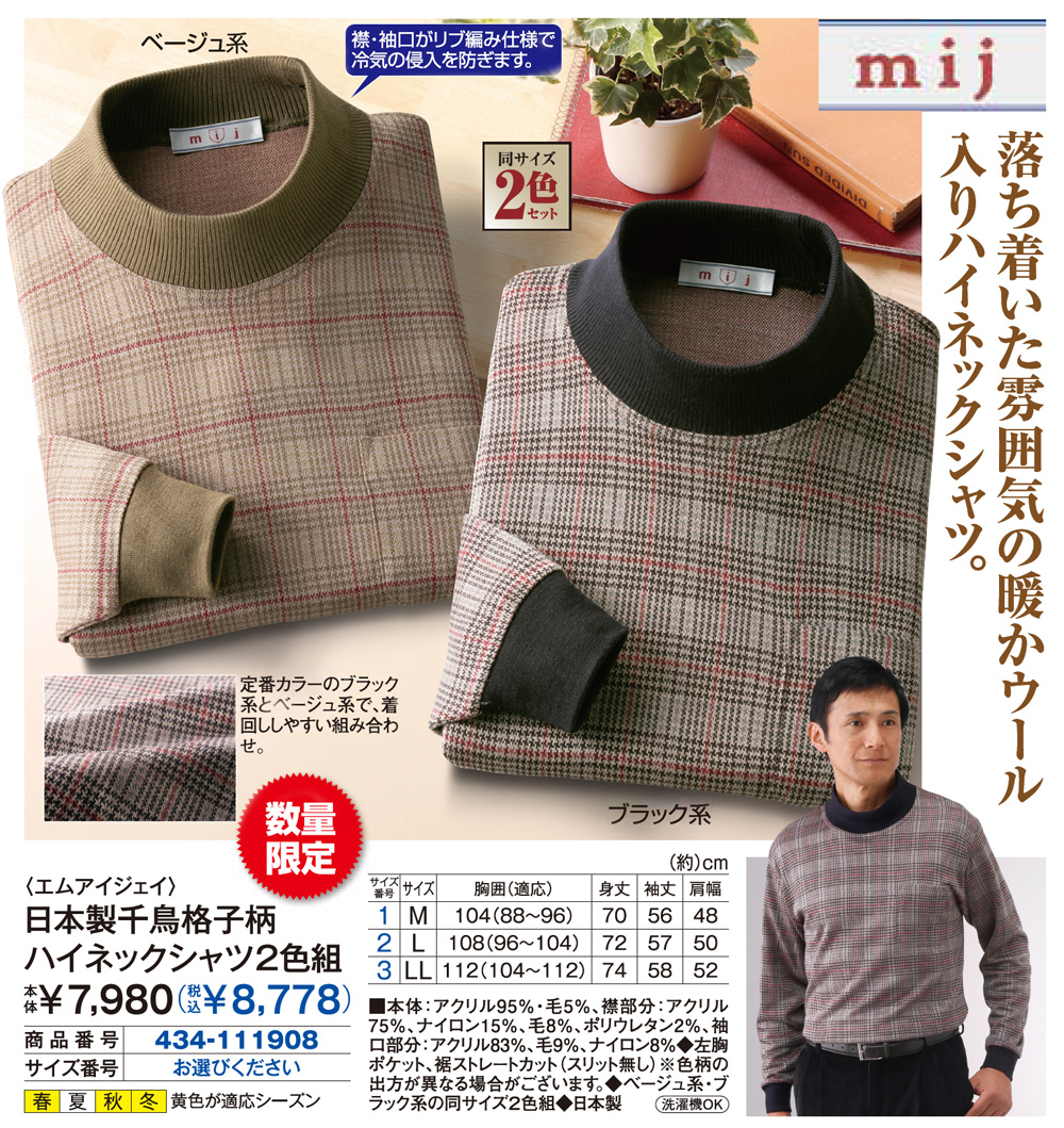 落ち着いた雰囲気の暖かウール入りハイネックシャツ。 襟・袖口がリブ編み仕様で冷気の侵入を防ぎます。 定番カラーのブラック系とベージュ系で、着回ししやすい組み合わせ。 同サイズ2色セット