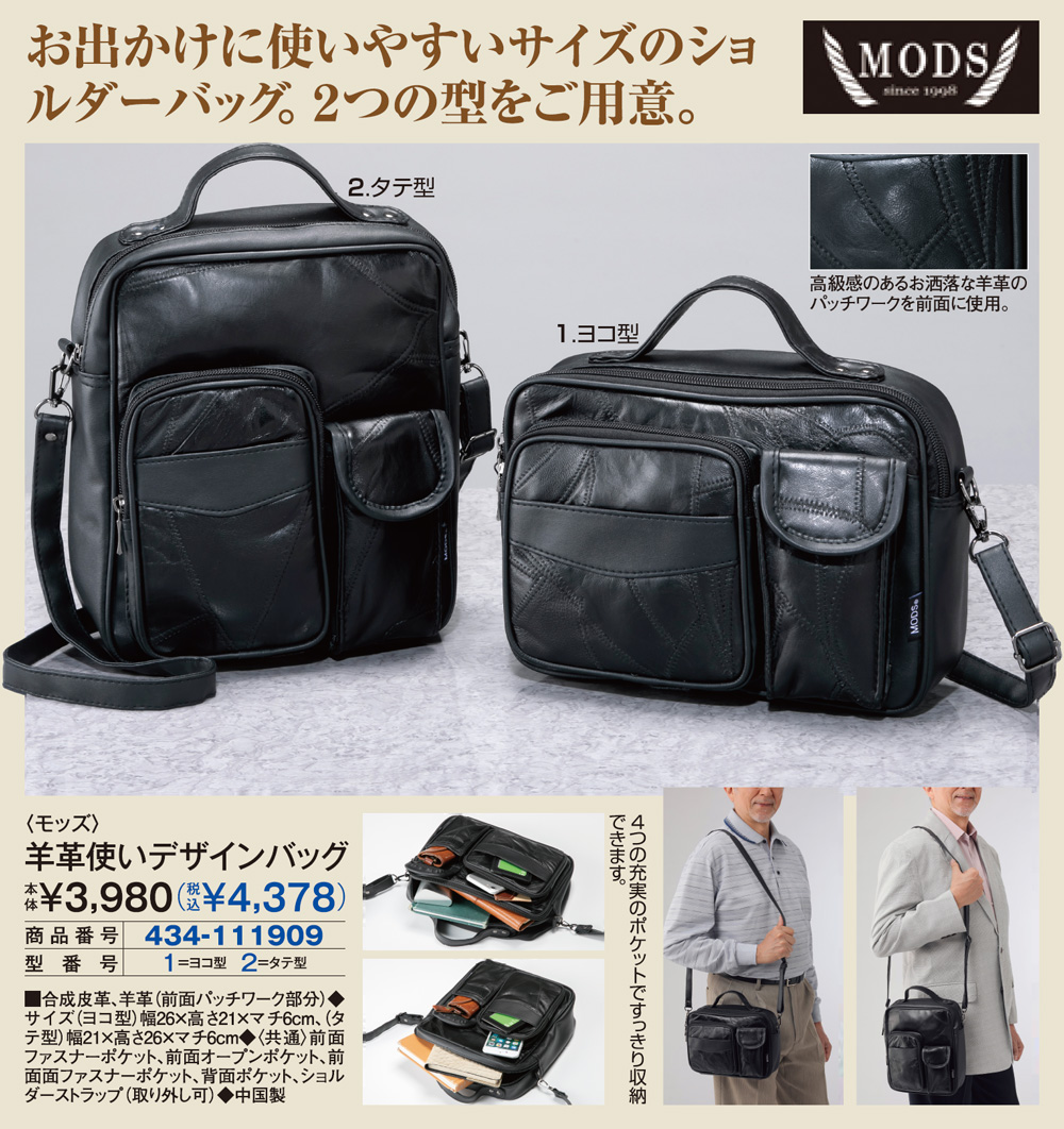 お出かけに使いやすいサイズのショルダーバッグ。 2つの型をご用意。 高級感のあるお洒落な羊革のパッチワークを前面に使用。 4つの充実のポケットですっきり収納できます。 タテ型:幅21×高さ26×マチ6cm ヨコ型:幅26×高さ21×マチ6cm