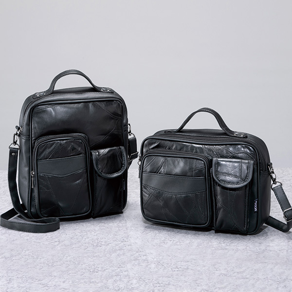 ■合成皮革、羊革(前面パッチワーク部分) ◆サイズ(ヨコ型)幅26×高さ21×マチ6cm、(タテ型)幅21×高さ26×マチ6cm ◆<共通>前面ファスナーポケット、前面オープンポケット、前面面ファスナーポケット、背面ポケット、ショルダーストラップ(取り外し可) ◆中国製
